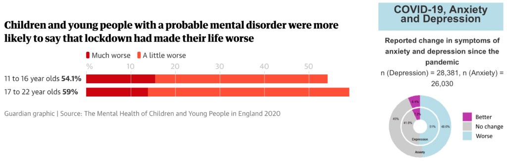 Lockdown has been hard on the 9 million people in the UK suffering from loneliness. Loneliness is a serious killer that has a global health detriment equivalent to smoking 15 cigarettes a day. Roughly 50% of people have had an increase in depressive or anxious symptoms (Figure 1). More than 2 million operations have been cancelled, which could lead to substantial numbers of lives lost due to neglect of other medical issues. Estimates are that 3 million cancer diagnoses might be delayed, and that a lockdown of six months would lead to an extra 173,540 years of life lost due to cancers that should have been caught earlier. More will suffer from mental health issues and those already suffering are reporting a greater reduction in their quality of life during lockdown. Predictions are that suicide will increase by 10%. There was a 50% increase in domestic violence helpline calls during the first lockdown in April.