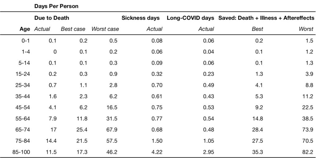 It’s easy to convert to lives saved because we had roughly 100k deaths in the year since the pandemic began. We can just multiply by 2.5 and 5 respectively, subtracting the actual losses, to get number of days of life saved by lockdown.