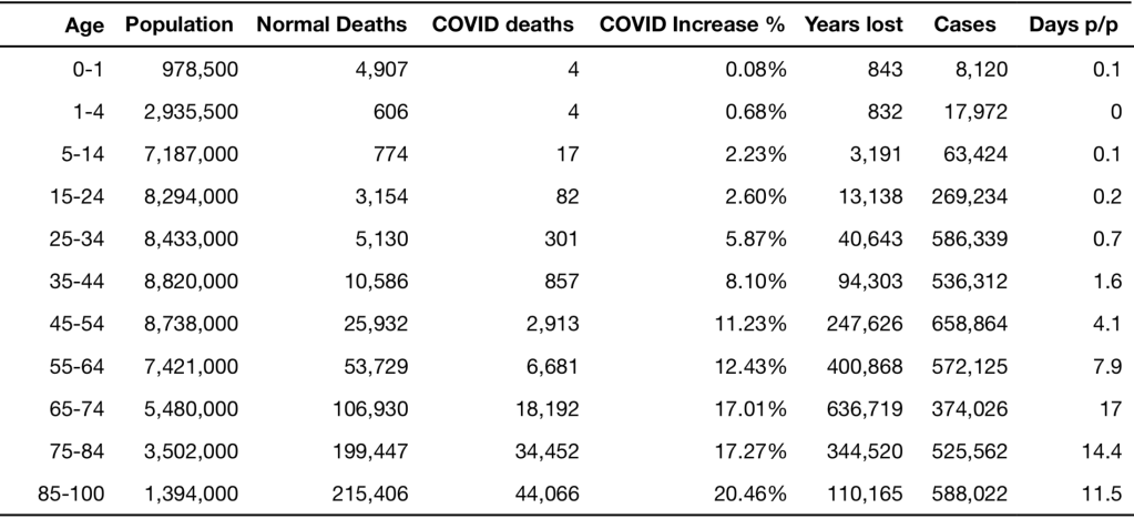 This is presented for eleven UK population age groups in Table 1. I initially chose to quantify these lockdown benefits using ‘years of life’ saved. A twenty year old who died of COVID might have lost 65 years of their life, but at the same time, the number of deaths in twenty year olds is 1 in 100,000. After starting the calculation I realised that the final numbers became tiny fractions and so it’s actually easier to organise these results using average days of life lost per person.